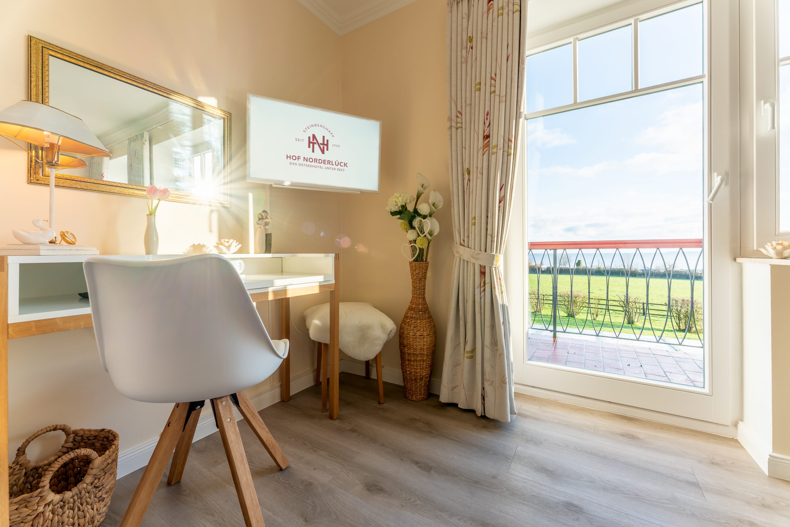 Vom romantischen Bett aus den Sonnenaufgang über der Geltinger Birk erleben. Sich in der gemütlichen Sitzecke vor den großen Fenstern an Gewesenes erinnern und Zukünftiges planen. Bei Sonnenuntergang ein kühles Getränk auf dem kleinen privaten Balkon genießen. Mee(h)r Glück und Entspannung geht nicht! Das elegante Romantikzimmer mit geräumigem Tageslichtbad bietet frisch Vermählten, ewig Verliebten, glücklichen (Langzeit-)Paaren und hoffnungslosen Romantikern die besten Voraussetzungen für einen Aufenthalt, der keine Wünsche offen lässt.