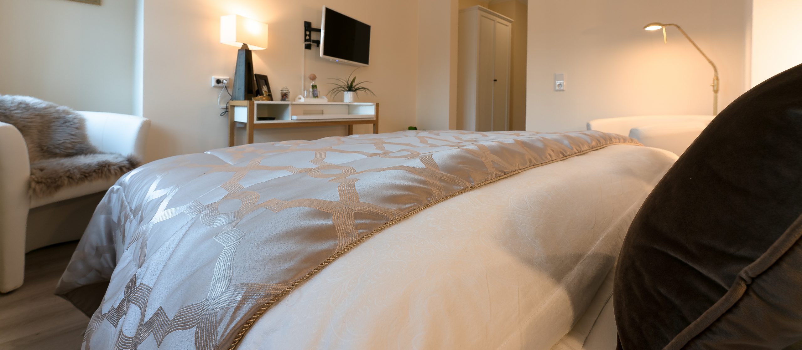 Dezent-goldene Eleganz unterm Reetdach – so begrüßt dieses Zimmer mit Blick auf den großen alten Walnussbaum im Innenhof seine Gäste. Ein Vorraum mit Kleiderschrank, ein geräumiges Badezimmer und im Zimmer selbst ist neben dem großen Doppelbett noch Platz für einen kleinen Schreibtisch und einen gemütlichen Sessel. So lässt es sich urlauben!