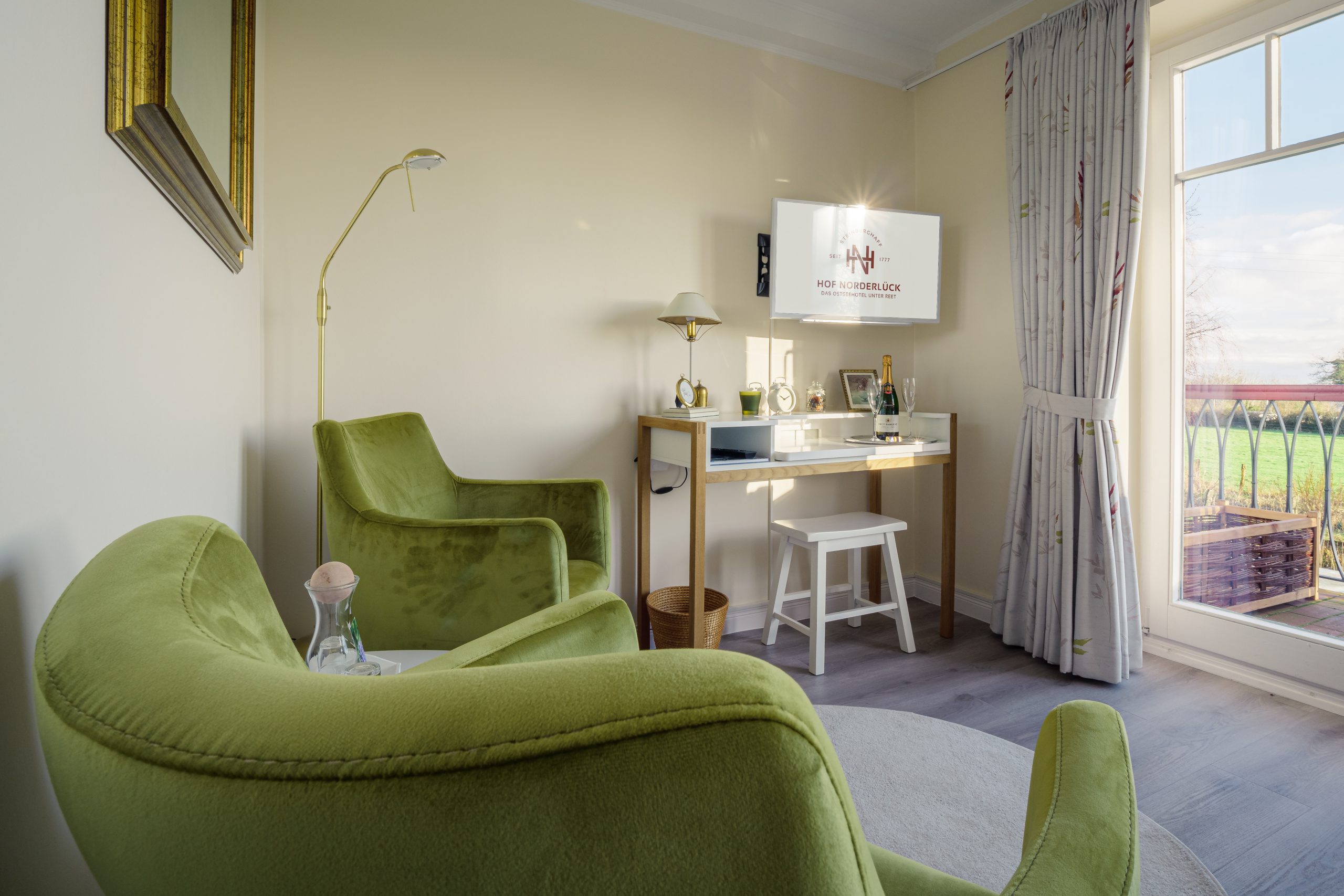 Schon im Bett den Meer- und Weitblick genießen. Von der gemütlichen Sitzgruppe aus dem Spiel von Wind und Wellen zuschauen. Oder ein Gläschen Wein auf dem privaten Balkon genießen. So lässt es sich leben im Ostseehotel unter Reet.